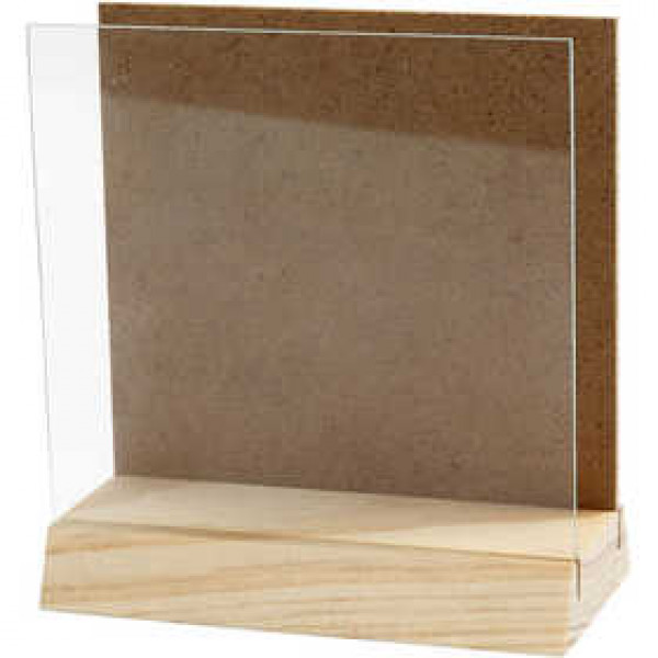 MDF en glazen plaat met voet van licht hout. Geschikt voor 3D technieken en projecten met een voor- en achterkant.