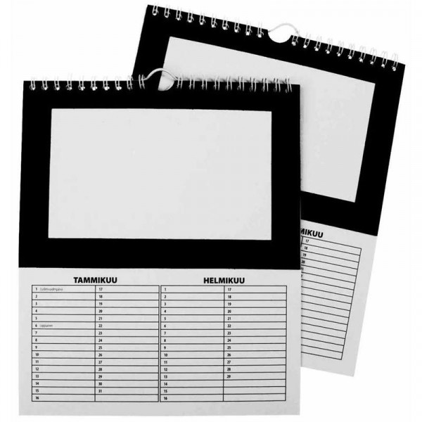 Spiraalgebonden kalender met 6 pagina's en zwart frame - makkelijk te decoreren met afbeeldingen en tekeningen - maat 19.3x23 cm.