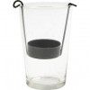Hoog waxinelicht van transparant glas met metalen hanger.