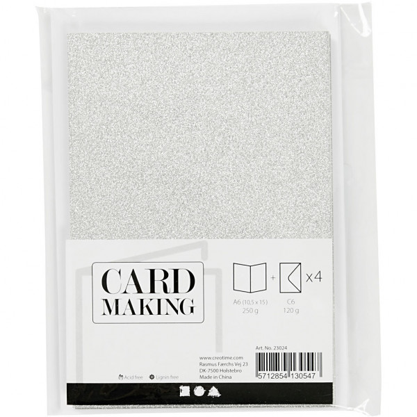 Kaarten en enveloppen, afmeting kaart 10,5x15 cm, afmeting envelop 11,5x16,5 cm, zilver, glitter, 4sets [HOB-23024]