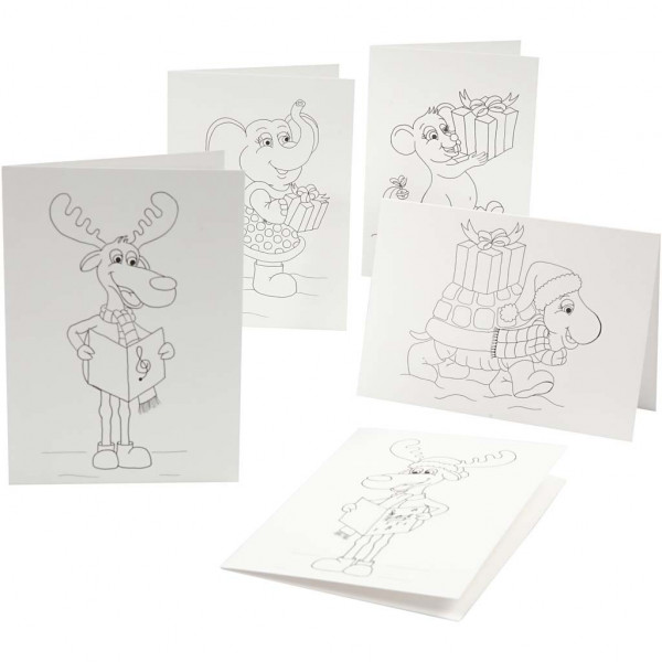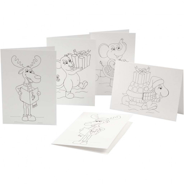 Kerstkaarten met ons eigen ontwerp, gemakkelijk te decoreren. Ideaal voor het inkleuren met stiften, waterverf, kleurpotloden etc.