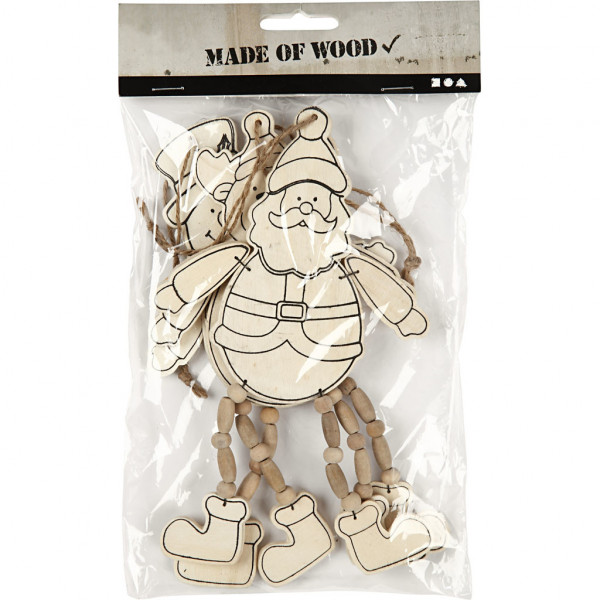 Decoratieve hangers van licht hout met kerstmotieven aan de voorkant en benen van houten kralen.