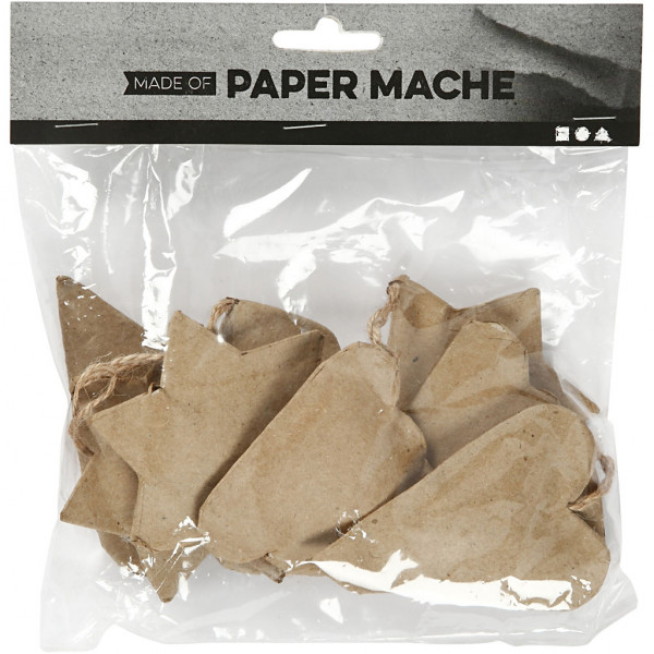 Handgemaakte kerstfiguren van papier-maché met ophangkoord.