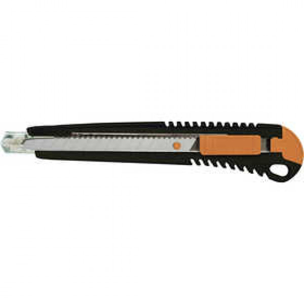 Rechtsnijdend mes van Fiskars met automatische mes opsluit systeem en plastic houder.