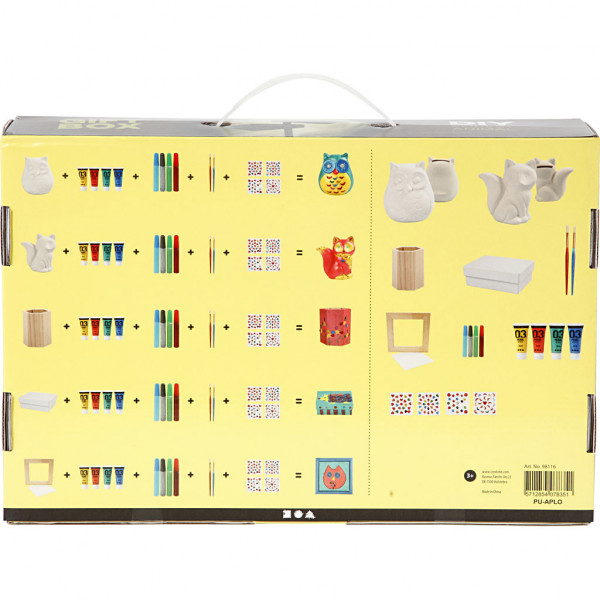 Set met creatieve materialen om bosdieren en andere items te versieren. Inclusief verf en kleine decoraties.