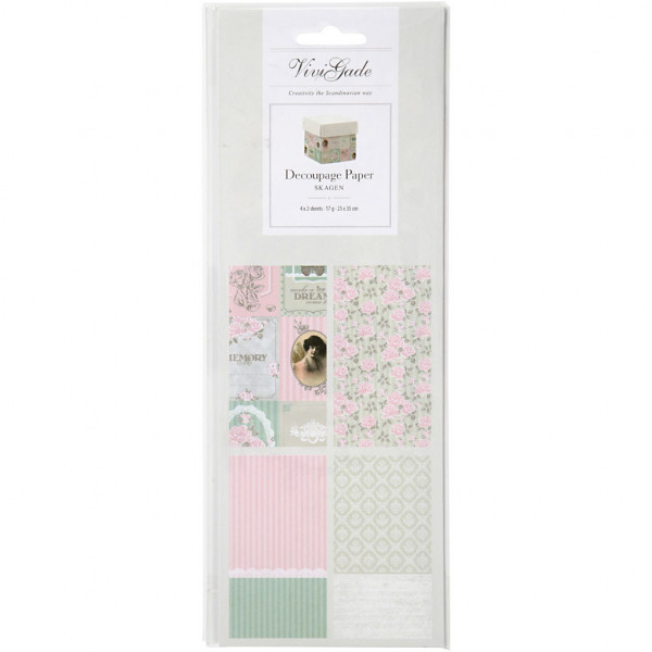 Assortiment enkelzijdig bedrukt, semi-transparant decoupagepapier met print van Vivi Gade.