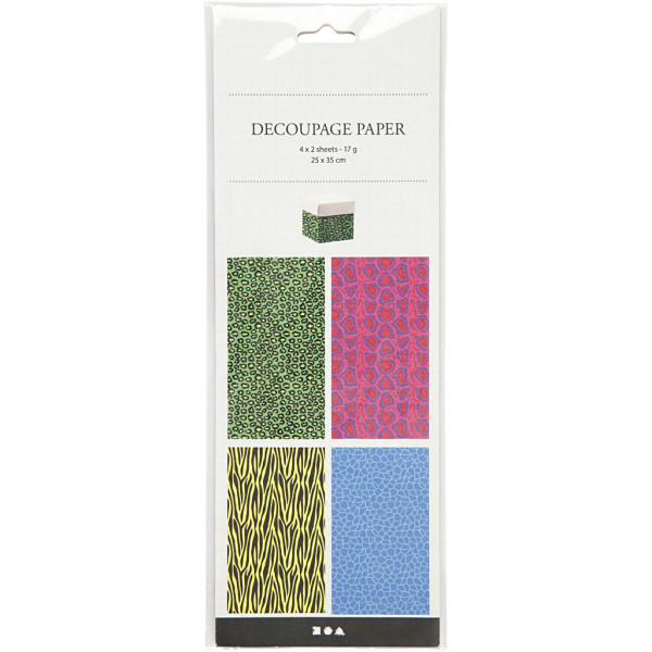 Decoupage papier, vel 25x35 cm, 17 gr, gekleurde dieren print, 8div vellen [HOB-254920]