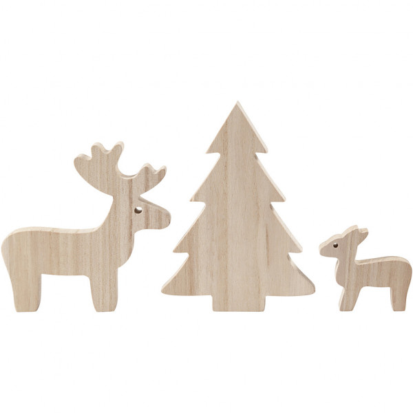 Klein en groot rendier en kerstboom van hout. De figuren hebben een platte voor- en achterkant en kunnen zelfstandig staan.