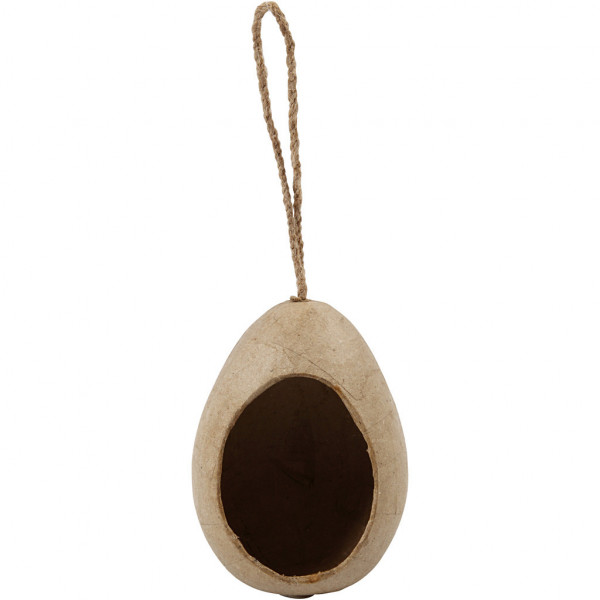 Handgemaakt ei van papier-maché met gat aan één kant om diverse decaraties in te maken. Aan de bovenkant een ophangkoord.