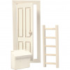 Gedetailleerde, houten elementen bestaande uit een rechtshangende deur met knop en een brievenbus met deksel die beide kunnen openen / sluiten. Inclusief ladder.