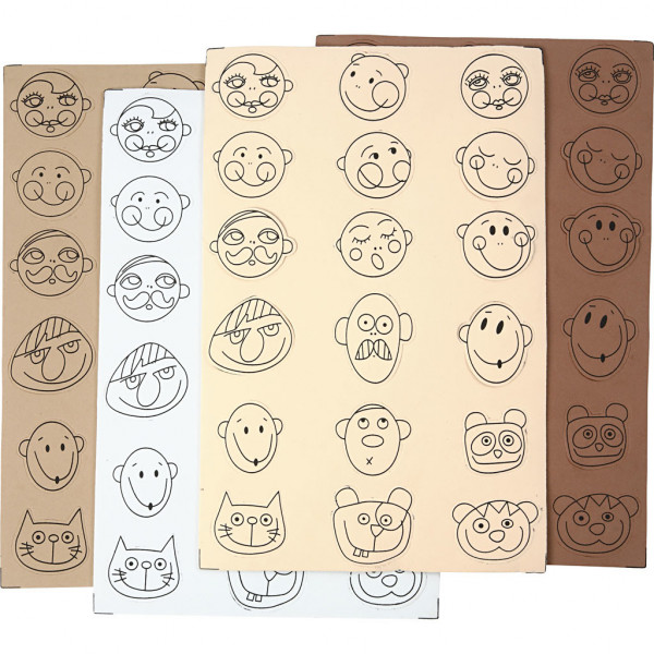 Pak met A4-vellen in 4 verschillende kleuren, van elke kleur 18 verschillende gezichten.