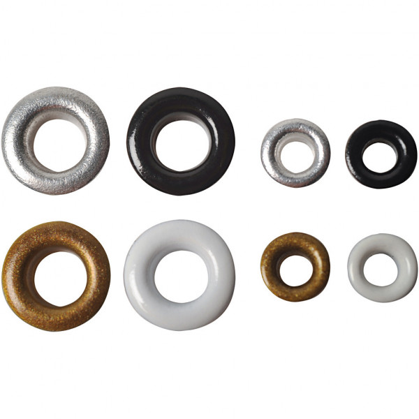 Ronde, metalen eyelets van Fiskars. Makkelijk te bevestigen met een eyelet setter.