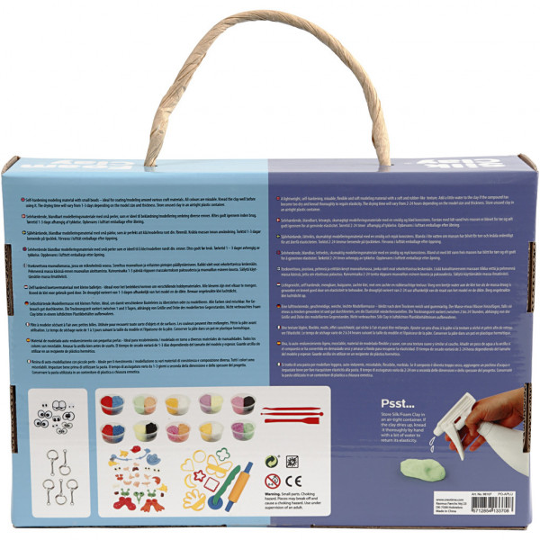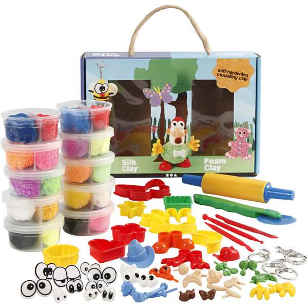 Inhoud: Foam Clay in 10 kleuren en Silk Clay in 10 kleuren. Plus gereedschap, uitsteekvormen, 9 paar ogen, diverse lichaamsonderdelen en 5 sleutelhangers om de creaties aan te hangen.