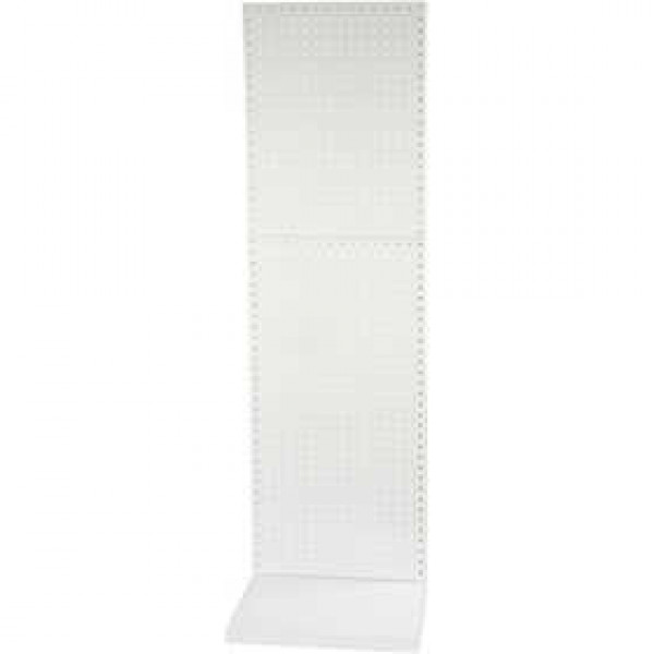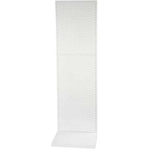 Robuust en flexibel display systeem van wit metaal met geperforeerde platen, L-basis en basis plank.