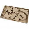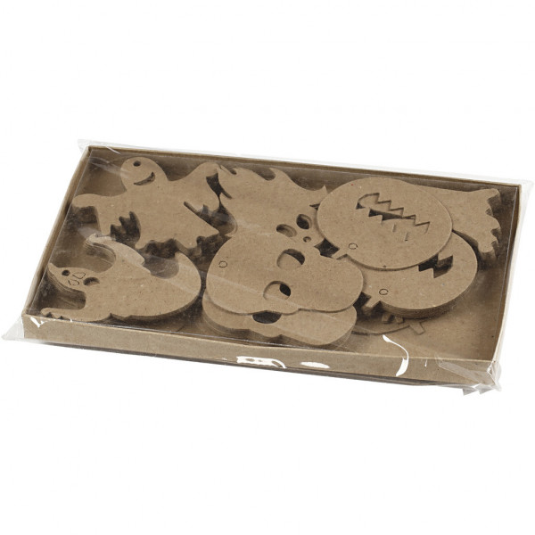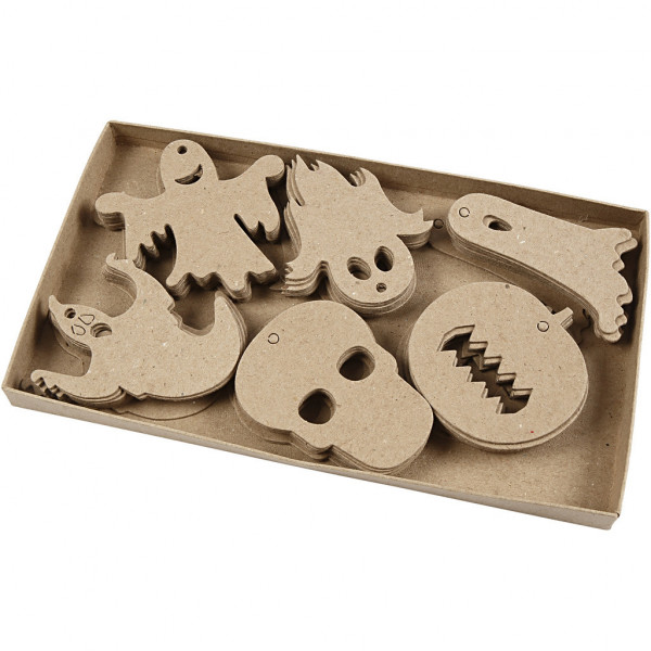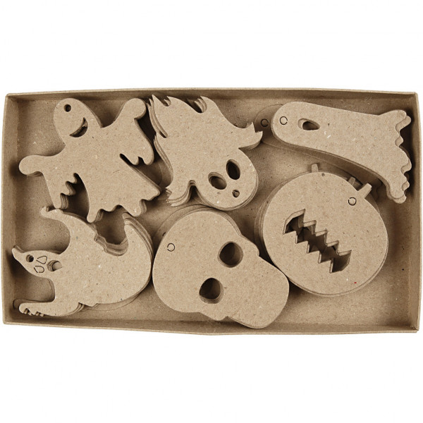 Platte figuren van karton met een ophangoog. Pak met 6 verschillende figuren voor Halloween, van elk 10 stuks.