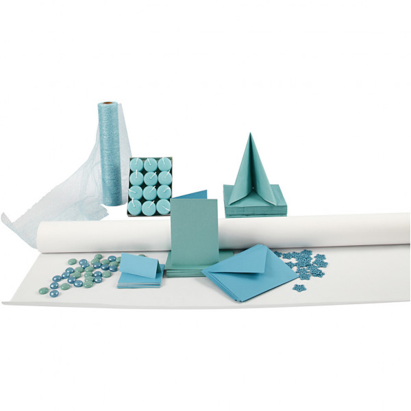 Inhoud: 10 pakken kaarten, 10x enveloppen, kleine naamkaarten, 10+m tafelkleed, 10m tafelloper, 12 kaarsen, 20 servetten, glasdecoratie en houten bloemen.