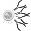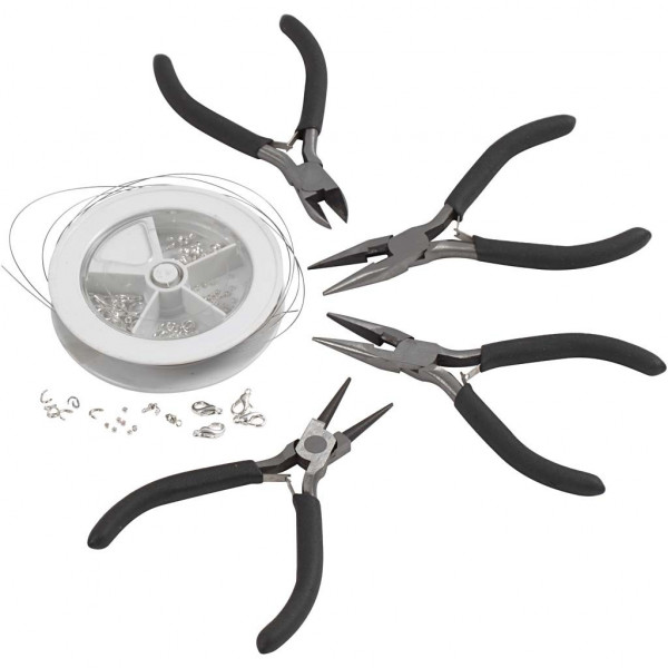 Inhoud: 4 sieradentangen (3 verschillende), 5 m sieradendraad en diverse sieraden onderdelen - totaal 100 stuks assorti.