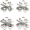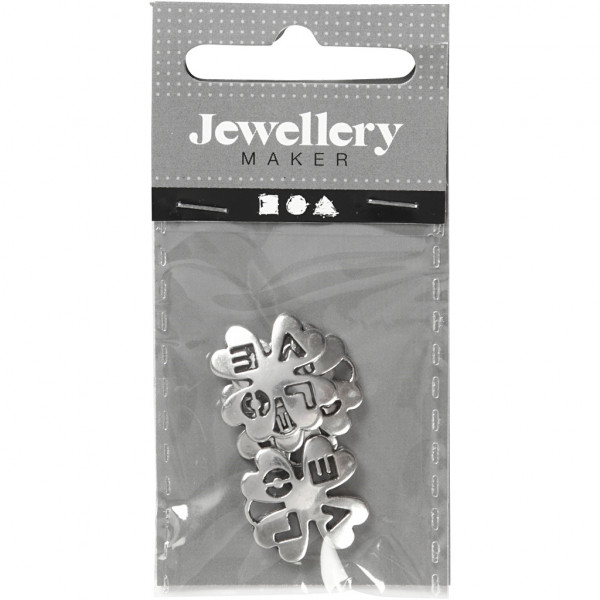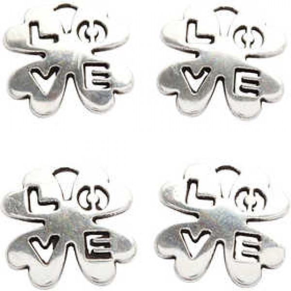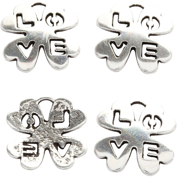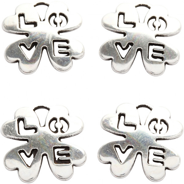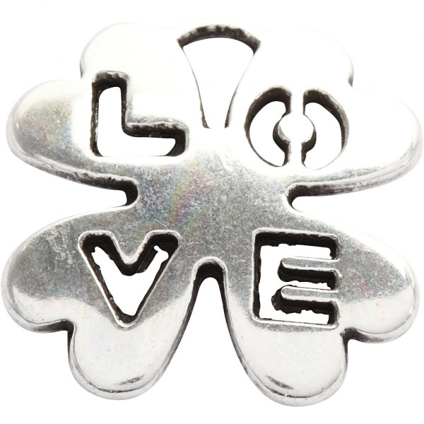 Metalen hanger in de vorm van een klavertje vier, op elk blad een letter die samen het woord LOVE vormen.