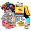 Inhoud: 200 bedrukte vellen en 300 vellen karton, 4 pakken wax krijtjes, 200 stuks dikker chenilledraad in 4 kleuren, diverse wiebelogen, 200 neonkleurige houten knopen, 60 kleine strikjes, pailletten en veren in verschillende kleuren.