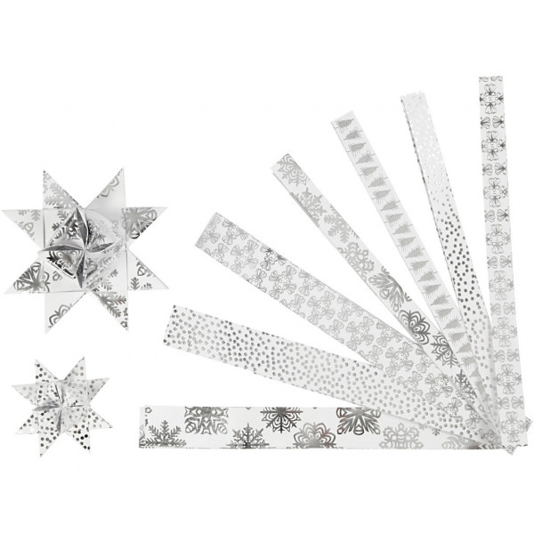 Papieren sterstroken, b: 15+25 mm, d: 6,5+11,5 cm, wit, zilver, metaalfolie, 48stroken, l: 44+78 cm [HOB-24360]