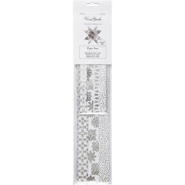 Papieren stroken voor het vlechten van sterren in een design van Vivi Gade. Stroken zijn twee-zijdig bedrukt en voorzien van details van metallic folie. Diameter geeft de maat van de kant-en-klare ster aan. Inclusief instructie.