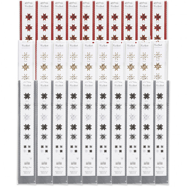Inhoud: 10 pakken van elk van de 3 kleuren, voor elk 12 sterren. Inclusief instructie.