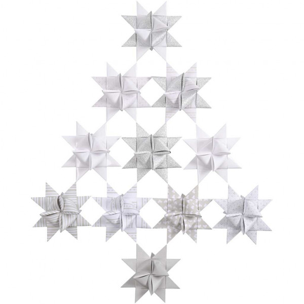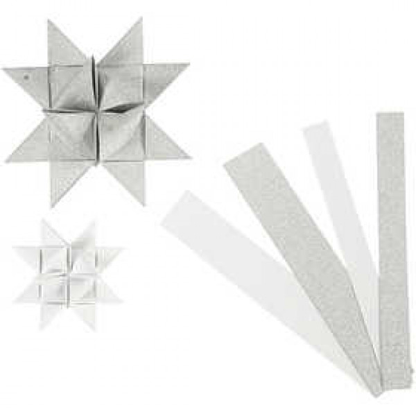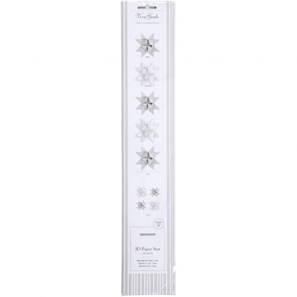 Dubbelzijdige papieren stroken in twee verschillende maten van Vivi Gade Design. Diameter geeft maat van de ster aan. Inclusief instructie.