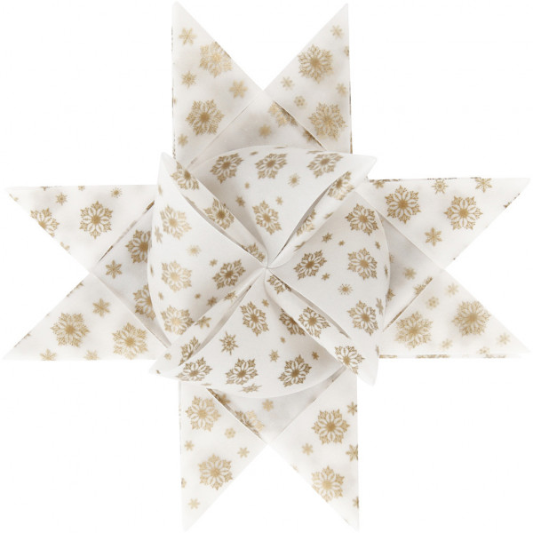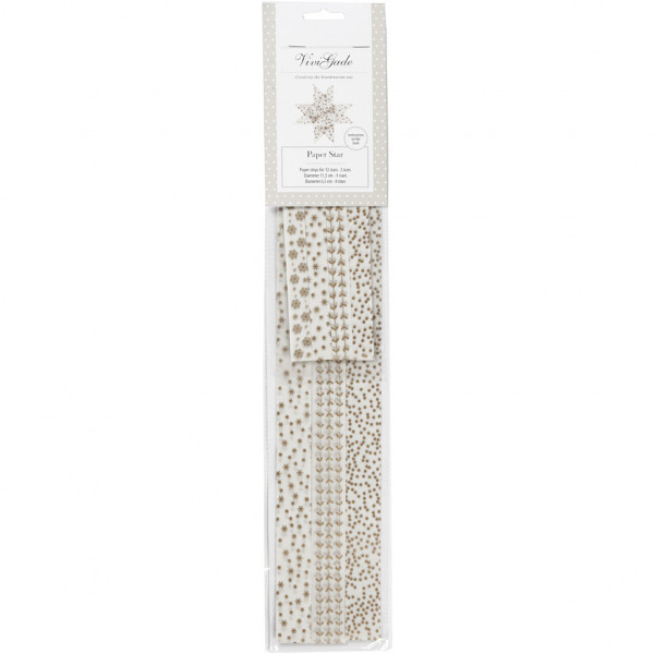 Stroken van vellum papier voor het vlechten van een ster in 2 maten. Bedrukt aan de ene kant met metallic folie met een design van Vivi Gade. Diameter geeft de afmetingen van de ster aan. Inclusief instructie.
