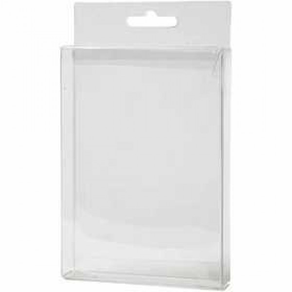Transparante, plastic vouwdoos met euro sleuf om op te hangen.