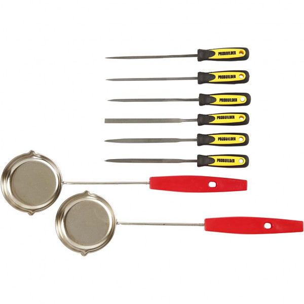 Inhoud: 1000 gr zelfhardende klei, 300 gr tinnen staafjes, 2 gietpannen en een set met 6 vijlen.