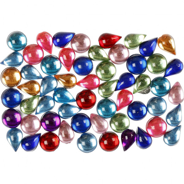 Mix van helder gekleurde ronde en druppelvormige decoratiestenen met platte achterkant.
