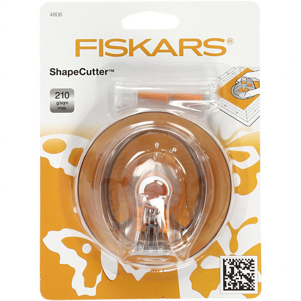 Fiskars Shape Cutter in ergonomische vorm en met softgrip greep. Het roterende mes volgt het sjabloon. Kan ook gebruikt worden om uit de losse hand te snijden.