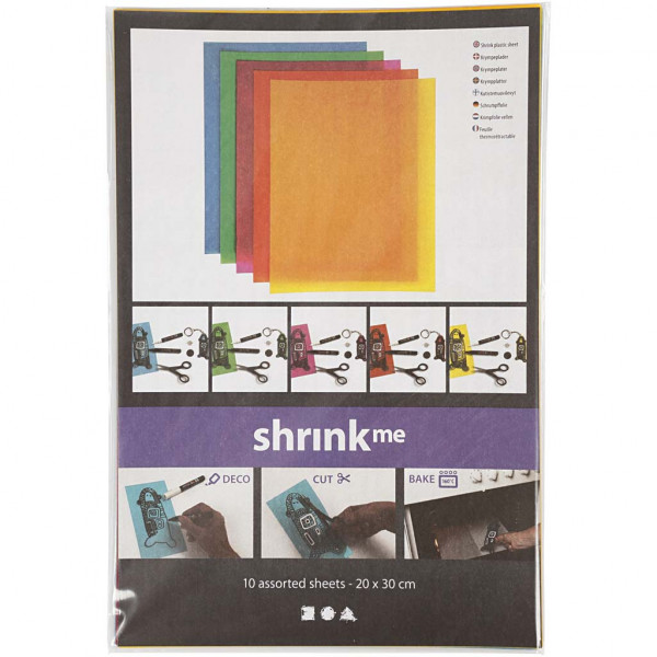 Deze vellen hebben zowel een matte als een glanzende kant. Zodra deze in een huishoudoven wordt verwarmd krimpt het plastic tot 40% van de originele grootte. Decoreer aan de matte kant met potloden en met permanente stiften aan de glanzende zijde.