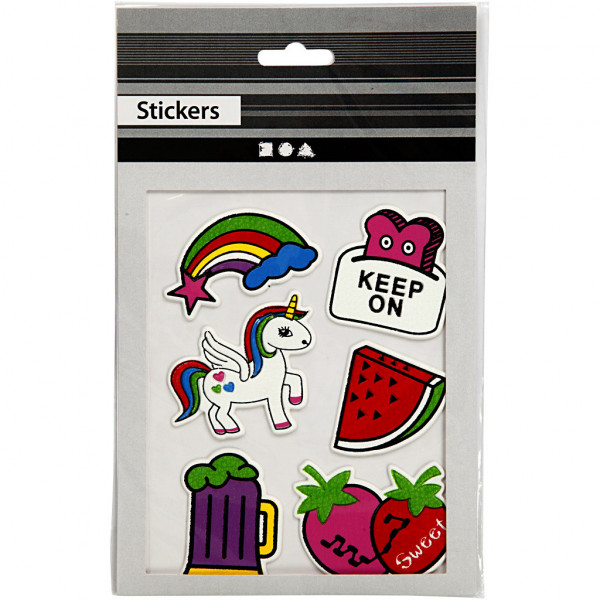 Zelfklevende stickers gemaakt van plastic, bedrukt met kleurrijke motieven. Te gebruiken als decoratie op tassen, mobiele telefoon hoezen en schoenen.