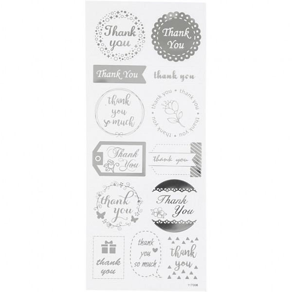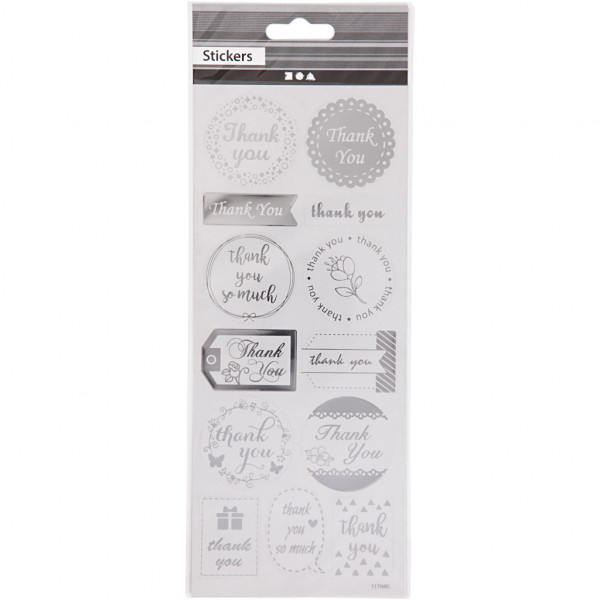 Stickers, vel 10x24 cm, circa 13 stuk, zilver, thank you, 1vel [HOB-29141]
