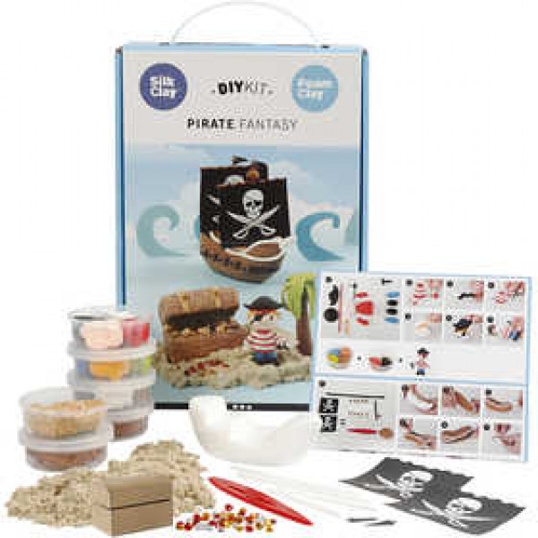 Inhoud: Foam Clay en Silk Clay in diverse kleuren voor het piratenschip, palmboom en de piraat. Plus een schatkist van hout, strasstenen voor een geheime schat en Snady Clay voor een verlaten eiland.