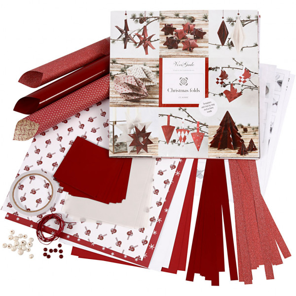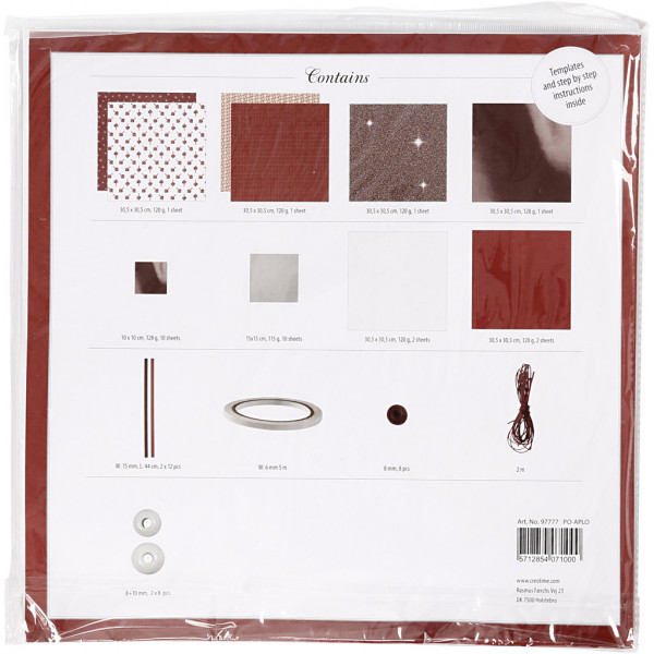 Inhoud: 5 verschillende vellen design papier, 4 vellen effen papier, 22 vel origamipapier, 24 vlechtstroken, 16 kralen van glas, 8 kralen van hout, 2 m waxkoord en 5 m dubbelzijdig klevend tape.