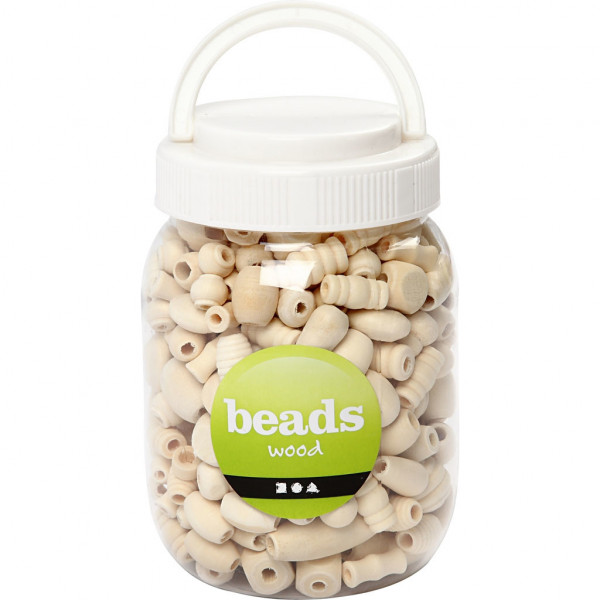 Medium grootte houten kralen. Geleverd in een plastic emmer.